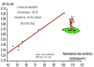Comme les lombrics qui en se nourrissant de la matière organique, permettent de libérer les éléments fertilisants pour les plantes. Ils sont les premiers intervenants de la chaine de transformation de la matière organique en humus. Ils favorisent également, par leurs galeries , le développement des racines dans le sol, l’infiltration de l’air, de l’eau, et les sols se réchauffent plus rapidement. Les lombrics se plaisent dans les pH élevés, leur population diminue de façon spectaculaire dans des pH bas.