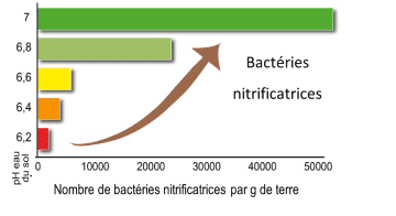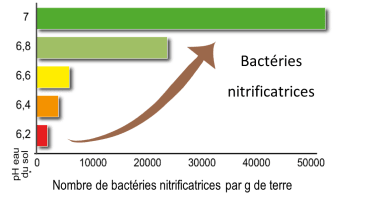 Comme les bactéries nitrificatrices qui permettent la transformation de l’azote ammoniacale en azote nitrique (forme d’azote préférentiellement absorbée par les racines). Là aussi, l’acidité est très pénalisante. On multiplie par 55 le nombre de ces bactéries en passant d’un pH de 6,2 à 7.