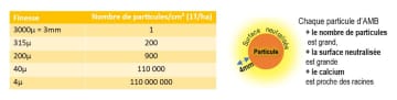 La finesse : pour un épandage à 1,5T/ha, ce ne sont pas moins de 165 millions de particules/cm² qui seront déposées à la surface du sol et qui pourront coloniser l’horizon travaillé. Pour rappel, chaque particule ne peut neutraliser autour d’elle, que dans un rayon de 4 à 5mm. Plus il y a de particules, plus l’amendement a une action forte, quelle que soit l’acidité du milieu