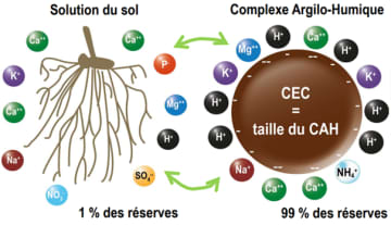 Cette réserve doit être constituée d’éléments indispensables en respectant un certain équilibre, comme du CALCIUM (> 80%), du Magnésium (6-8%), et du Potassium (3-4%). Quand on ajoute les concentrations de ces éléments, on obtient le taux de saturation = S/CEC.