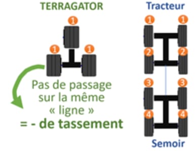A ce sujet, il est important de mettre en avant les particularités du TERRAGATOR . Son poids est équivalent à un attelage semoir pulvérulent – tracteur. En revanche, ses 3 roues en décalé et la largeur de ses pneus basse pression changent tout . La répartition du poids sur le sol est bien moins importante.