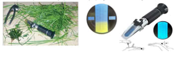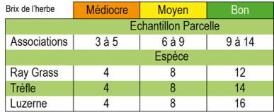 2 - Les bons taux de sucres : test du BRIX Le taux de Brix permet de quantifier les sucres issus de la photosynthèse des plantes. En association graminées légumineuses, un taux de BRIX de 9 à 14 % permet d’obtenir un fourrage riche en sucres et une meilleure conservation du fourrage par voie humide. Ci-contre les résultats à obtenir suite aux mesures avec le refractomètre.
