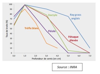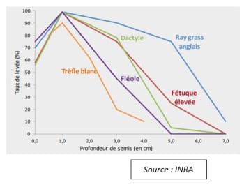 En sol acide, un apport de carbonate de calcium en surface favorisera l’implantation et l’enracinement des plantes. La profondeur de semis Les mélanges graminées légumineuses demandent une attention particulière sur la profondeur de semis, ce sont de petites graines qui méritent une implantation soignée. La profondeur de semis idéale pour des mélanges graminées légumineuses doit être dans le 1 er cm de profondeur du sol. La levée des légumineuses est grandement affectée si la graine est semée plus profondément.