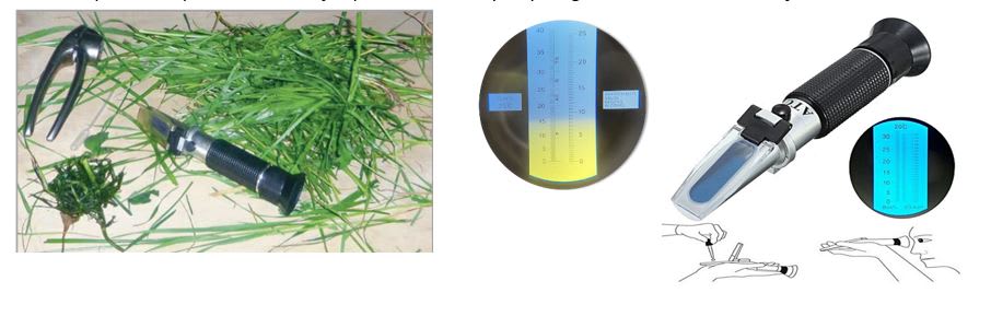 AM :Fauche à 10h / PM : Fauche à 15h Source: Ragio et Al Mode d’emploi du refractomètre Au préalable, vérifier que le réfractomètre est bien calibré (poser sur la lunette 2-3 gouttes d’eau distillée et mettre le réfractomètre à 0 avec l’aide du petit tournevis fournit).
